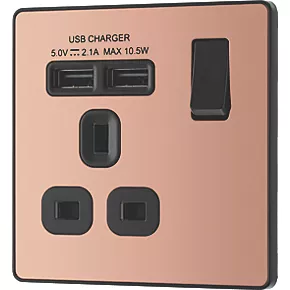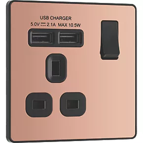 British General Evolve 13A 1-Gang SP Switched Socket + 2.1A 2-Outlet Type A USB Charger Copper with Black Inserts