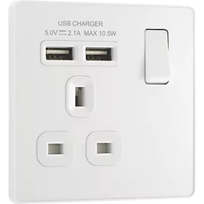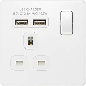 Single power socket with 2 USB charging ports. Offers ability to charge mobile devices without using extra sockets. Auto-detects USB device and adjusts charging pattern to suit, switching to standby mode when fully charged to prevent overload. Features low profile, screwless flat plate that clips on and off, making it ideal for modern interiors.