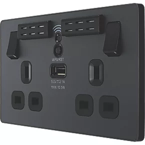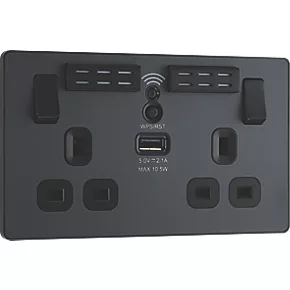 British General Evolve 13A 2-Gang SP Switched Double Socket With WiFi Extender + 2.1A 1-Outlet Type A USB Charger Grey with Black Inserts