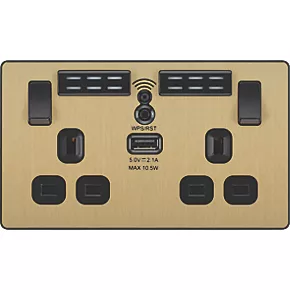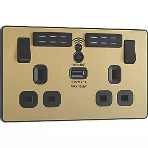 British General Evolve 13A 2-Gang SP Switched Double Socket With WiFi Extender + 2.1A 1-Outlet Type A USB Charger Satin Brass with Black Inserts