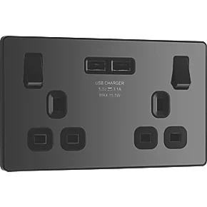 British General Evolve 13A 2-Gang SP Switched Socket + 3.1A 2-Outlet Type A USB Charger Black with Black Inserts