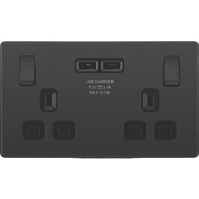 Double power socket with 2 USB charging ports. Offers ability to charge mobile devices without using extra power sockets. Auto-detects USB device and adjusts charging pattern to suit, switching to standby mode when fully charged to prevent overload. Features low profile, screwless flat plate that clips on and off, making it ideal for modern interiors. Suitable for retro-fit to 35mm back box.