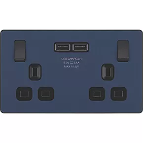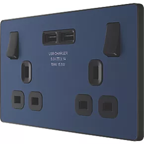 British General Evolve 13A 2-Gang SP Switched Socket + 3.1A 2-Outlet Type A USB Charger Blue with Black Inserts