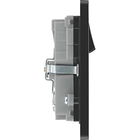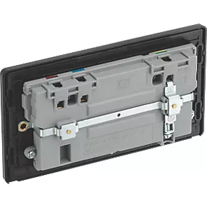 Double power socket with 2 USB charging ports. Offers ability to charge mobile devices without using extra power sockets. Auto-detects USB device and adjusts charging pattern to suit, switching to standby mode when fully charged to prevent overload. Features low profile, screwless flat plate that clips on and off, making it ideal for modern interiors. Suitable for retro-fit to 35mm back box.