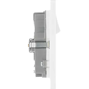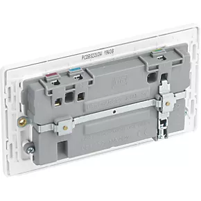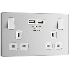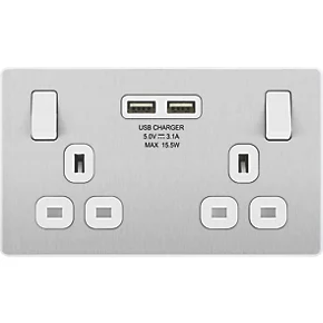 Double power socket with 2 USB charging ports. Offers ability to charge mobile devices without using extra power sockets. Auto-detects USB device and adjusts charging pattern to suit, switching to standby mode when fully charged to prevent overload. Features low profile, screwless flat plate that clips on and off, making it ideal for modern interiors. Suitable for retro-fit to 35mm back box.