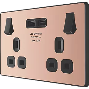 British General Evolve 13A 2-Gang SP Switched Socket + 3.1A 2-Outlet Type A USB Charger Copper with Black Inserts