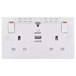 Double switched socket with colour-coded terminals and backed out captive screws for ease of installation. Fits 35mm back box, making it suitable for retro-fit replacement of existing sockets. Features low profile, screwless flat plate that clips on and off, ideal for modern interiors.