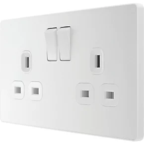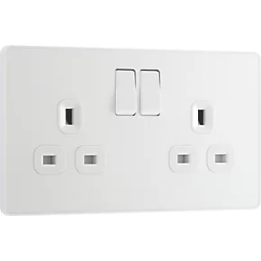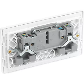 Double switched socket with colour-coded terminals and backed out captive screws for ease of installation. Fits 35mm back box, making it suitable for retro-fit replacement of existing sockets. Features low profile, screwless flat plate that clips on and off, ideal for modern interiors.