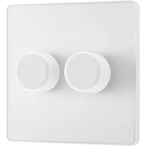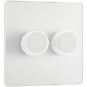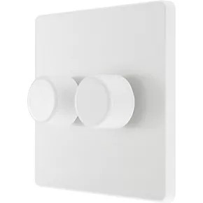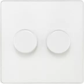Evolve, trailing edge, double dimmer switch that controls light levels and sets mood. Intelligent electronic circuit monitors connected load and provides a soft-start with protection against thermal, current and voltage overload. Suitable for dimming LED, dimmable CFLs and traditional lighting. Soft-start brings the lights to a set level in around 1 second and extends lamp life. Silent operation means no noise when dimming, while support for low wattage lamps eliminates flicker. Low profile screwless flat plate that clips on and off. Ideal for modern interiors.