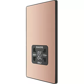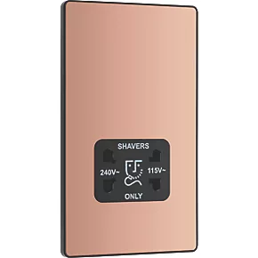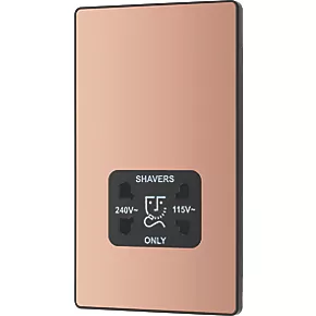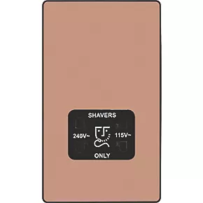 Polished copper, dual voltage shaver socket, suitable for use with both 240V and 115V shavers and electric toothbrushes. Low profile screwless flat plate clips on and off, making it ideal for modern interiors. Easy to install, with captive, backed out terminal screws to prevent screw loss.
