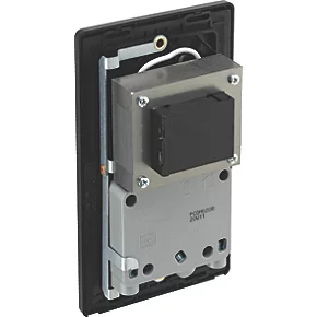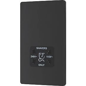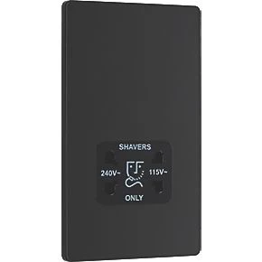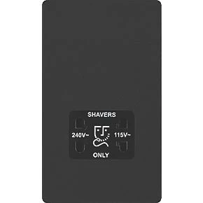 Matt black, dual voltage shaver socket, suitable for use with both 240V and 115V shavers and electric toothbrushes. Low profile screwless flat plate clips on and off, making it ideal for modern interiors. Easy to install, with captive, backed out terminal screws to prevent screw loss.