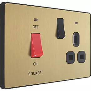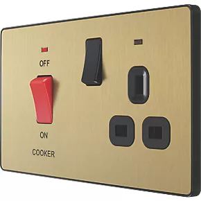 British General Evolve 45A 2-Gang 2-Pole Cooker Switch & 13A DP Switched Socket Satin Brass with LED with Black Inserts