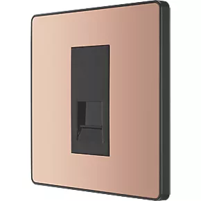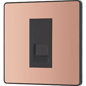 Polished copper secondary telephone socket with easy-to-install, screw terminal connection. For use as additional telephone point, feeding from master telephone socket. Features low profile, screwless flat plate that clips on and off, making it ideal for modern interiors.