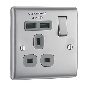 Be the first to review “British General Nexus Metal 13A 1-Gang SP Switched Socket + 2.1A 2-Outlet Type A USB Charger Brushed Steel with Graphite Inserts” Cancel reply