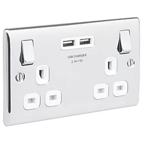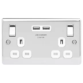 British General Nexus Metal 13A 2-Gang SP Switched Socket + 3.1A 2-Outlet Type A USB Charger Polished Chrome with White Inserts