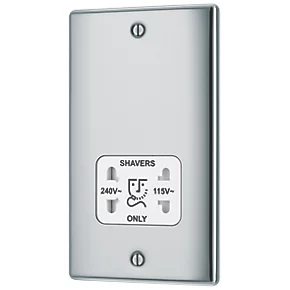 British General Nexus Metal 2-Gang Dual Voltage Shaver Socket 115 / 240V Polished Chrome with White Inserts