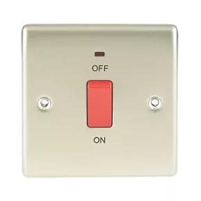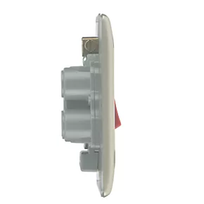 Double pole switch with LED indicator for use with cookers and ovens. Features slim profile with rounded edges and moisture control gasket to prevent tarnishing from new plaster.